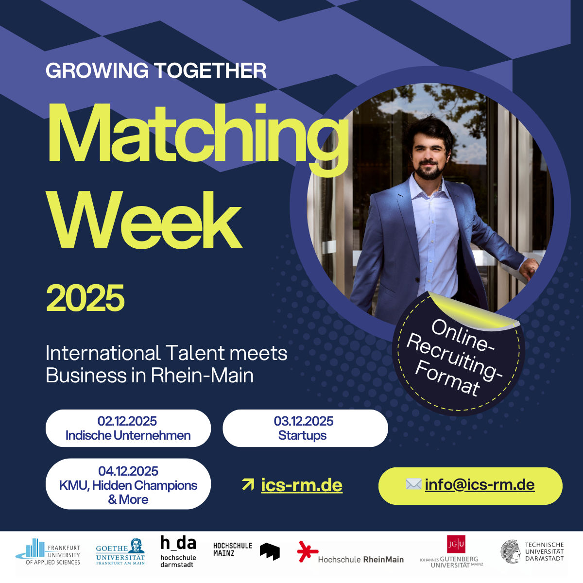 Die Matching Week ist eine Online-Karrierewoche, die speziell internationale Studierende sowie Studierende mit Migrationsgeschichte aus der Rhein-Main Region anspricht. Sie bietet eine Plattform, auf der Arbeitgeber und potenzielle Mitarbeiter*innen in einem digitalen Rahmen zusammenkommen. Die Interviews mit den Bewerber*innen finden in Videocalls statt, nachdem die Arbeitgeber sich vorher aus den für sie eingegangenen Bewerbungen die passenden Kandidat*innen ausgesucht haben. Das Event wird an allen sieben Partnerhochschulen beworben.